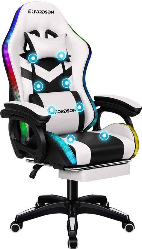ELFORDSON Faux Leather Swivel PC & Racing Gaming Chair With LED & Massage, White